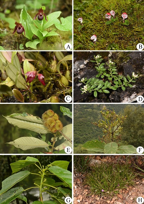 图1. 本次调查到的部分物种:A. 波密杓兰Cypripedium ludlowii;B. 大理铠兰Corybas taliensis;C. 波密卷瓣兰Bulbophyllum bomiensis;D. 互生红景天Rhodiola alterna;E. 西藏柯Lithocarpus xizangensis;F. 藏南丁香Syringa tibetica;G. 滇桐Craigia yunnanensis;H. 芒苞草Acanthochlamys bracteate。(摄影:B、F&G刀志灵、其他郭世伟) 本次调查到的目标物种共计26种。其中:极小种群野生植物有无苞杓兰Cypripedium bardolphianum、大理铠兰Corybas taliensis、滇桐Craigia yunnanensis、大花醉鱼草Buddleja colvilei、云南梧桐Firmiana major、旱地木槿Hibiscus aridicola、芒苞草Acanthochlamys bracteate等;极度濒危物种包括波密杓兰Cypripedium ludlowii、秀丽兜兰Paphiopedilum venustum、互生红景天Rhodiola alterna、错那景天Sedum tsonanum、全萼秦艽Gentiana lhassica、匙叶甘松Nardostachys jatamansi等;西藏自治区重点保护植物有西藏含笑Michelia kisopa、西藏木莲Manglietia caveana、西藏柯Lithocarpus xizangensis、藏南丁香Syringa tibetica、锡金冷杉Abies densa、阴湿小檗Berberis humidoumbrosa、波密卷瓣兰Bulbophyllum bomiensis等;并重点调查了旗舰物种大花红景天Rhodiola crenulate。本次调查系统采集了目标物种及重要伴生植物的标本903号2710份,分子材料2796份,拍摄图片5万余张。
