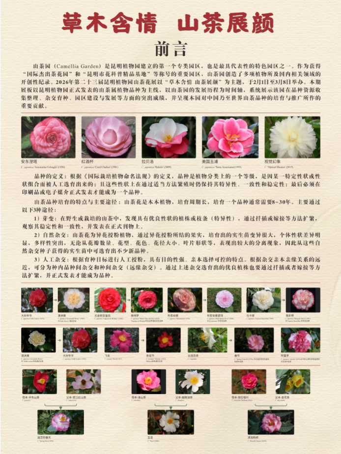 本次花展中,昆明植物园科技工作者精心保育的百余盆“精品山茶”将在东园门口展出,其中有云南山茶Camellia reticulata、尖连蕊茶C. cuspidata、凹脉金花茶C. impressiervis等为代表的原生物种,也有昆园丹霞C. reticulata ‘Kunyuan Danxia’、春色浪漫C. grijsii ‘Chunse Langman’等植物园刚注册的国家授权山茶花新品种亮相。蔡希陶纪念碑旁的科普长廊尽显“草木含情 山茶展颜”话题,以山茶园的发展历程为时间轴,系统展示了山茶园在品种资源收集整理、杂交育种、园区建设与发展等方面的突出成绩,呈现昆明植物园对中国乃至世界山茶品种培育与推广所作的重要贡献。