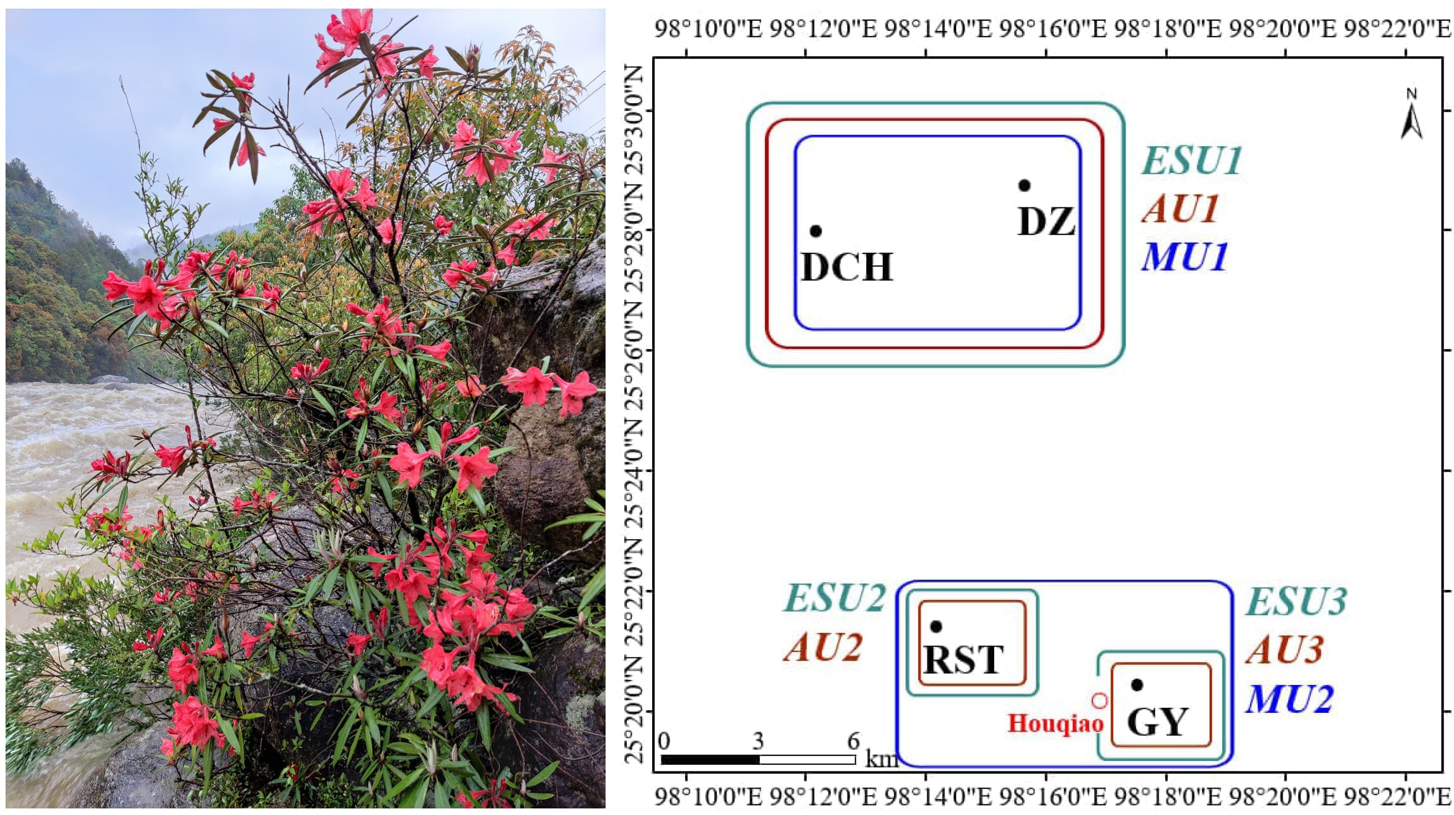 图1 基于SNPs和SVs的种群遗传结构 DCH,大岔河;DZ,胆扎;RST,热水塘;GY,古永 进一步分析显示,种群间基因流极为有限,4个种群明明近在咫尺,最近仅约6公里,却“老死不相往来”,成了“最熟悉的陌生人”。为何短短6公里,却成了无法逾越的鸿沟?研究认为,人类活动导致的栖息地破碎化是主要原因。人类活动如农田开垦、村落扩展、道路修建,将原本连续的生境切割成独立“斑块”。朱红大杜鹃依赖凤蝶传粉,而凤蝶飞行能力有限、对人类活动敏感。生境破碎化阻碍了花粉在不同种群间的传播,导致种群逐渐走向遗传隔离与衰退。 基于以上研究结果,我们将4个种群划分为3个进化显著单元(ESUs)和3个适应单元(AUs)。为便于保护管理,将大岔河(DCH)和胆扎(DZ)种群划分为1个管理单元(MUs),热水塘(RST)和古永(GY)种群合并为另一个管理单元。该划分方案既考虑了遗传特性,也兼顾了保护实践的可操作性,为今后开展针对性的就地保护与迁地保育提供了科学依据。