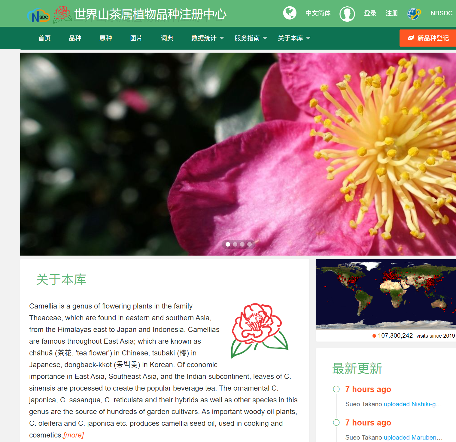 图1:2026年1月12日世界山茶属植物品种注册中心数据访问量 据悉,该网站由科技部国家基础学科公共科学数据中心资助、中国科学院昆明植物研究所主导建设、国际知名山茶专家合作完成的在线专业数据库。该库涵盖自1621年以来全球山茶属下的茶花、茶叶和茶油等所有品种信息,包含53070个已发表品种名称,其中接受名达27227个,并配有7.8万余张精美的图片等。每个品种包含接受名、异名、中英日三国语言的形态描述、品种来源、相关文献、培育国家和年份、亲本来源等重要数据,并建立了一套严格的数据审核与更新机制,为全球用户提供了一个免费、权威、全面、便捷的在线信息服务平台,有效解决了全球山茶属植物品种信息“碎片化”和“标准化缺失”的不足。 目前,该网站已成为本领域世界多家行业机构认证的、权威的数据库,并先后成为国际合作的典范:国际园艺学会认证的山茶属植物品种的登录标准库,国际山茶协会、美国茶花协会等推荐使用的山茶属植物品种标准库,新版国际杰出茶花园评审方案中山茶属植物名称鉴定和植物标签的标准库,中国科学院英文版官网推荐的科学数据库之一。此外,该库还获得了多个国内外重要奖项,获得了第十三届中国茶花博览会金奖,主持人王仲朗先后获得了国际山茶协会颁发的主席勋章和皇家园艺学会颁发的大卫·特雷汉山茶花杯等。
