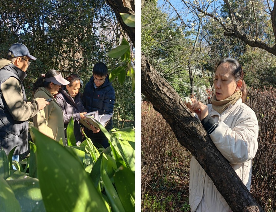 图1:华珊在我园现场指导梅花品种鉴定 经鉴定,园区内分布有48株梅花植株。其中,41株梅花已确定分属17个品种;梅花原生种1株,树龄约超过30年;待鉴定植株6株。它们被分散定植于东园、所园区、蔷薇园、百草园和扶荔宫等多个专类园区。工作人员依据鉴定结果,更新和完善了昆明植物园活植物信息系统(PIMS)系统的梅属植物物种信息,上传了植株特写照片,提升了数据档案质量。此外,本次邀请特定植物类群专家现场鉴定的工作模式,对园区内其他植物类群的鉴定工作具有借鉴意义。