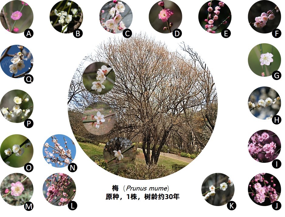 图3:我园已鉴定梅花品种(制图:高富) (A:白须朱砂 (Prunus mume ‘Baixu Zhusha’);B:变绿萼 (Prunus mume ‘Bian Lü-e’);C:飞蝶 (Prunus mume ‘Feidie’);D:丰后 (Prunus mume ‘Fenghou’);E:红怀抱子 (Prunus mume ‘Honghuai Baozi’);F:昆明宫粉 (Prunus mume ‘Kunming Gongfen’);G:六瓣淡粉 (Prunus mume ‘Liuban Danfen’);H:龙潭玉蝶 (Prunus mume ‘Longtan Yudie’);I:美人梅 (Prunus mume ‘Meiren Mei’);J:水朱砂 (Prunus mume ‘Shui Zhusha’);K:素白台阁 (Prunus mume ‘Subai Taige’);L:桃红朱砂 (Prunus mume ‘Taohong Zhusha’);M:晚粉抱子 (Prunus mume ‘Wan Yun’);N:小宫粉 (Prunus mume ‘Xiao Gongfen’);O:小绿萼 (Prunus mume ‘Xiao Lü-e’);P:复瓣绿萼 (Prunus mume ‘Fuban Lü-e’);Q:江梅 (Prunus mume ‘Jiang Mei’);其中,梅,原种植株照片作者为高富;C照片作者为华珊;Q照片作者为黄汉文;其他照片作者均为文妍莉。)