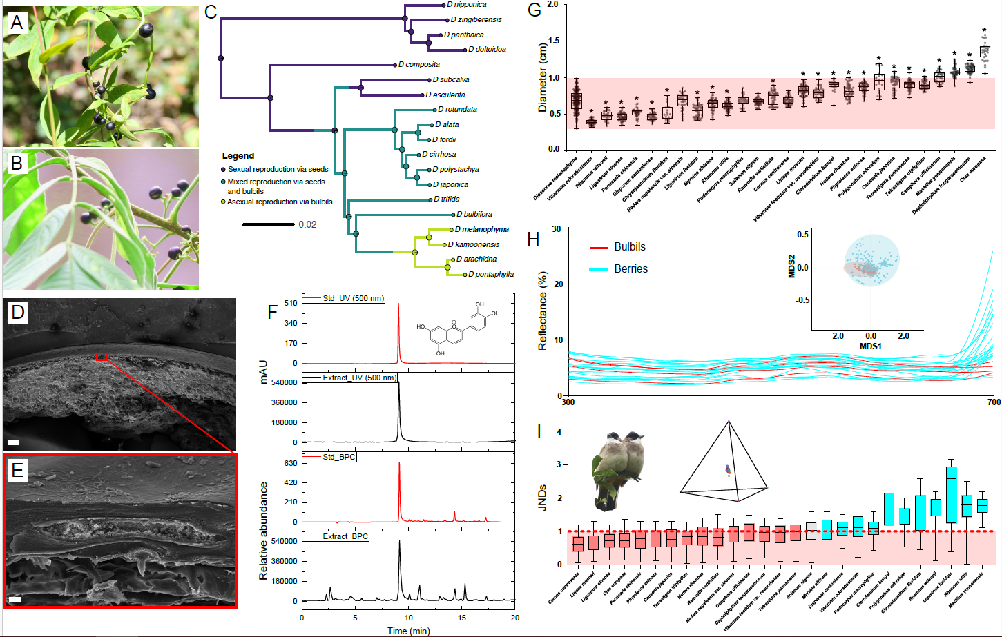 自然界中,大部分植物通过开花结果、产生种子来繁衍后代,种子靠风、水、动物等传播到远方。但也有少数植物失去了这种有性繁殖的能力,只能通过无性繁殖——比如通过珠芽来“复制”自己。然而,这些克隆后代往往只能落在母株附近,面临生存空间和资源竞争的压力。那么,这些植物如何突破这种“走不远”的困境呢? 黑珠芽薯蓣(Dioscorea melanophyma)是一种分布于中国西南山区多年生藤本植物。这一物种就面临着有性繁殖丢失,仅依靠珠芽繁殖的情况。有趣的是,它的珠芽黝黑光亮,形态上与黑色浆果高度相似,甚至在标本中常被误判为果实。对此,我们猜测,珠芽是否通过模拟黑色浆果,以达到其被远距离传播的目的。 为验证这一猜想,中国科学院昆明植物研究所陈高研究团队开展了系统研究。通过对比珠芽与多种同域浆果的外形特征,发现这种珠芽的大小变化范围很广,能模仿多种浆果的尺寸,吸引不同体型的鸟类。更重要的是,在鸟类的视觉模型下,珠芽的反射光谱与黑色浆果几乎完全重叠——也就是说,在鸟看来,这就是浆果。扫描电子显微镜和化学分析进一步表明,珠芽表面的黑色来源于单层表皮细胞中的木樨黄定(luteolinidin)。