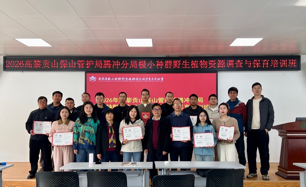 2026年3月16日至18日,来自云南高黎贡山国家级自然保护区保山管护局腾冲分局的14名专业技术骨干在中国科学院昆明植物研究所参加了由昆明植物园和云南省极小种群野生植物综合保护重点实验室举办的“极小种群野生植物资源调查与保育培训班”。 本次培训紧扣极小种群野生植物保护实际需求,采用理论授课与技能实操相结合的模式开展。理论培训为期2天,内容系统全面,涵盖极小种群野生植物保护政策与规划解读、保护方法与野外回归要点、野外调查规范技术、种苗繁育与管护技术、高黎贡山生物多样性及矮马先蒿资源概况及分类识别等关键内容,为参训人员夯实理论基础。技能实操为期1天,培训现场教学与实践紧密结合。学员在昆明植物园内开展野外植物调查、植物标本制作等实操训练,并实地参观学习极小种群野生植物保育温室、扶荔宫,在实际场景中提升实践操作能力。培训结束后,中国科学院昆明植物研究所云南省极小种群野生植物综合保护重点实验室主任孙卫邦研究员为全体学员颁发结业证书。 此次培训针对性强、内容务实,有效提升了云南高黎贡山国家级自然保护区一线科技人员在极小种群野生植物资源调查、监测、繁育及保育等方面的专业能力,为云南高黎贡山国家级自然保护区极小种群野生植物的科学保护、精准管护与可持续保育提供了坚实的技术支撑。